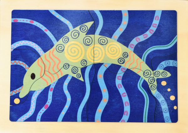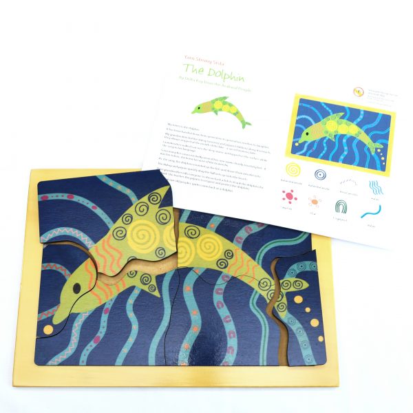 The dolphin has been thoughtfully brought to life through artwork by Annette Sax, a respected Taungurung woman and artist from Victoria. Measuring 30cm x 20cm, this puzzle is a meaningful educational resource that supports storytelling, fosters cultural awareness, and promotes respect for Aboriginal perspectives in early learning settings.